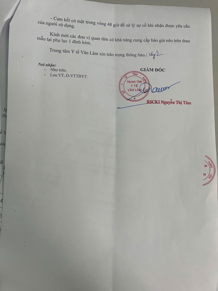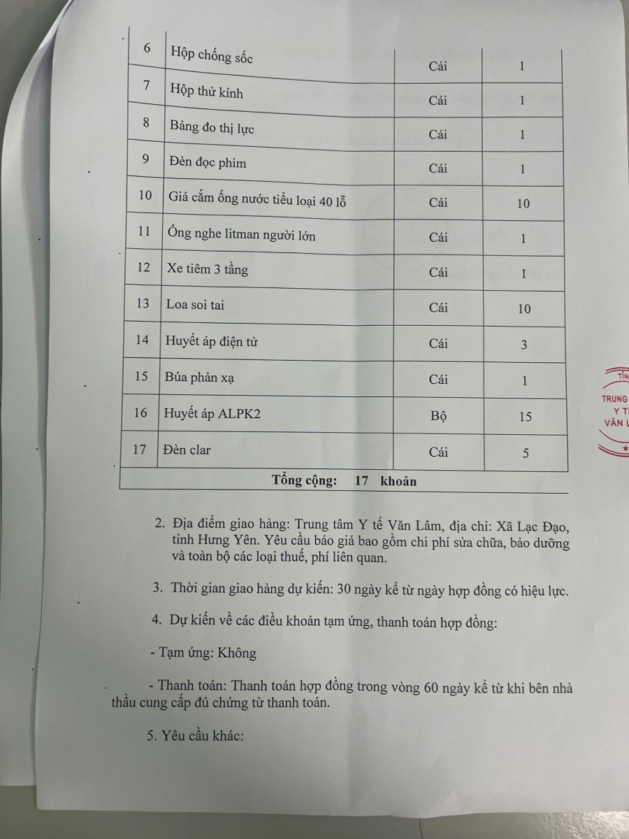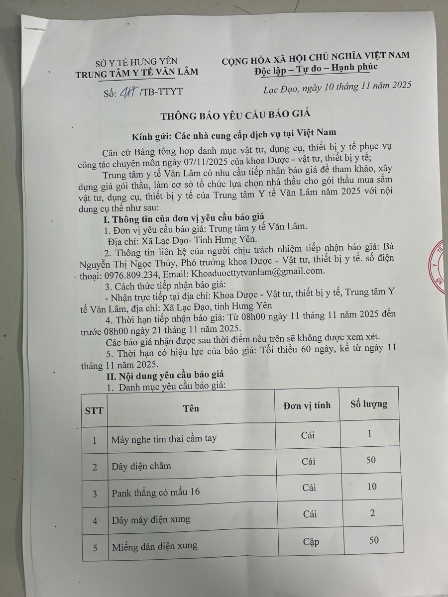 Báo giá gói thầu mua sắm vật tư, dụng cụ, thiết bị y tế tại TTYT Văn Lâm
