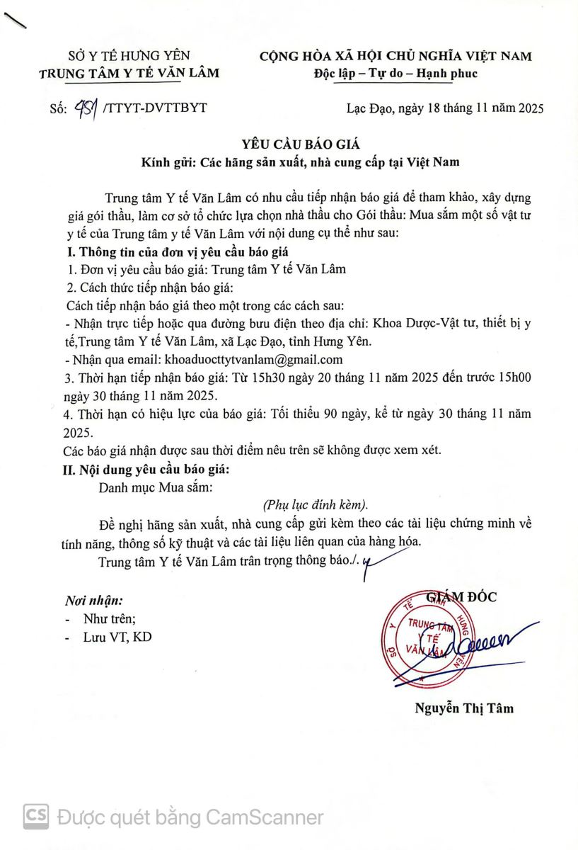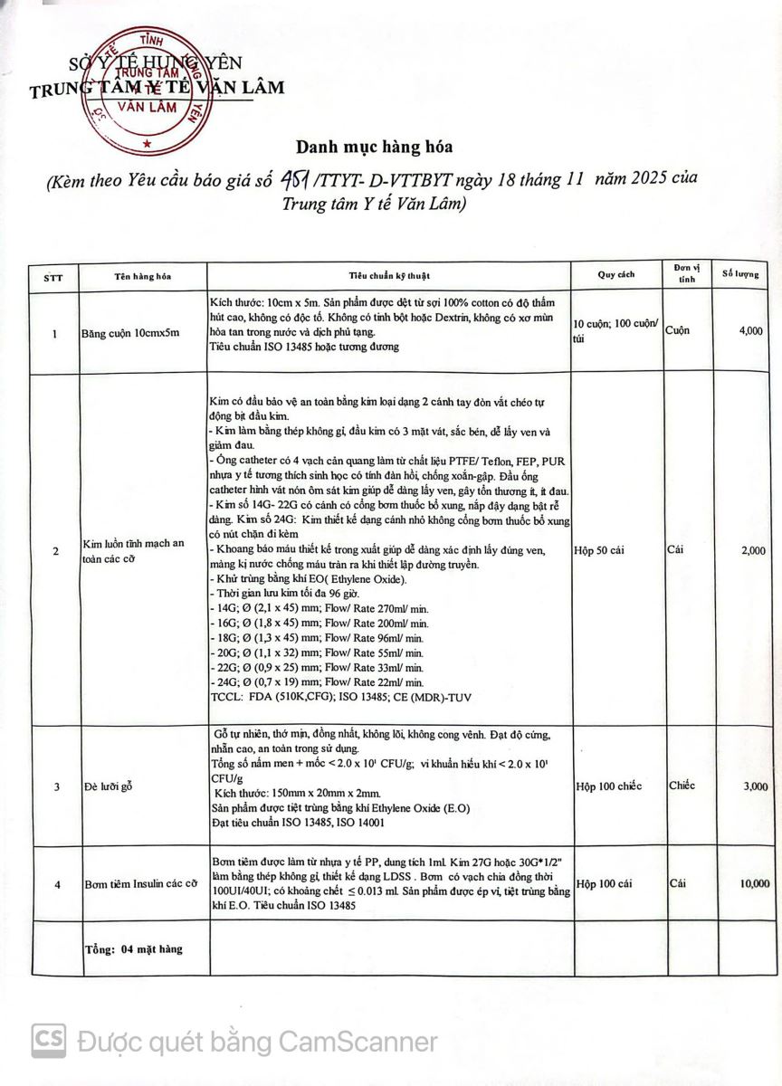 Yêu cầu báo giá để tham khảo, xây dựng giá gói thầu Mua sắm một số vật tư y tế tại TTYT Văn Lâm